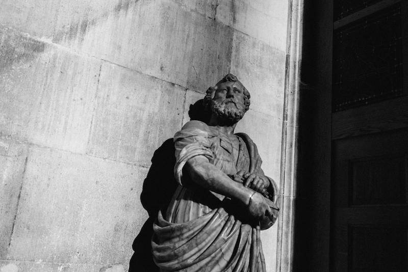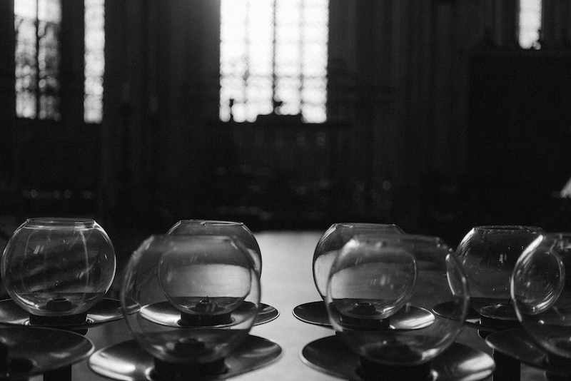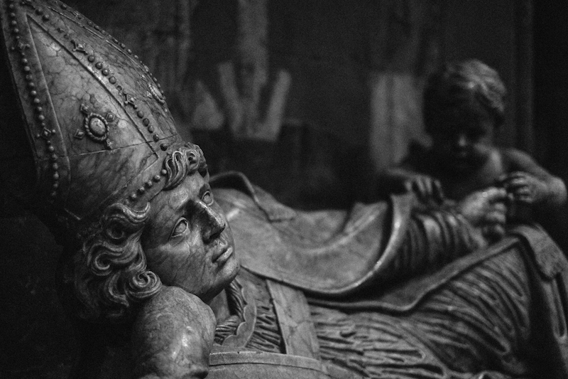 It’s the light which finds its way through the huge colored mosaic windows, some from the Middle Ages, the latest one from the contemporary painter Gerhard Richter. This soft, multicolored light paints the dark surfaces and the resting sculptures of saints, but interestingly enough this only emphasizes the darkness and the mediaeval atmosphere of the cathedral, minimizing human beings to dwarfs. The manichaeism of black and white.