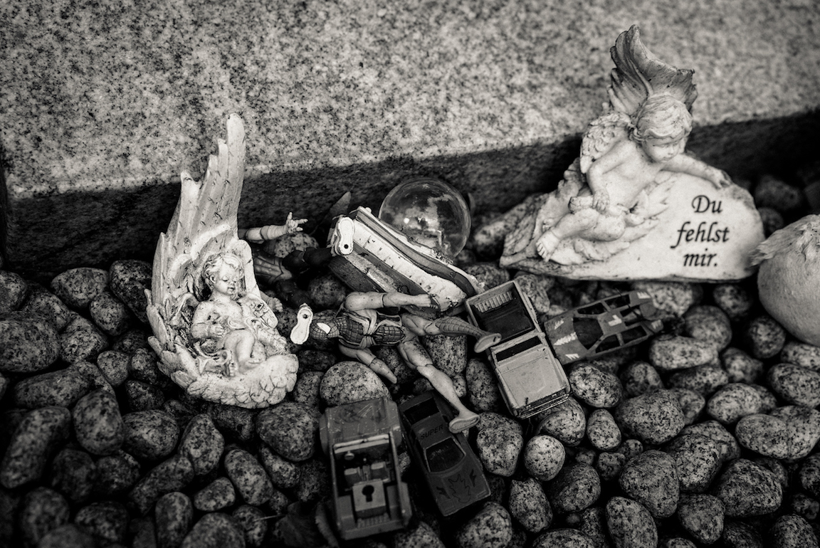 I’m not visiting the cemetery every weekend, I am really not. Actually I wanted to go to the forest. But the weather just wasn’t stable enough to risk the long drive. So it had to be the cemetery, just a 15 minutes distance with my bicycle. It was rather cold, the first weekend of autumn. At 9.00 am. Nobody there. But a rather simple techno-sound, brutally loud, it wafted from the street. I had forgotten, that the Cologne Marathon was announced for Sunday. And so I passed the small and the monumental tombs, spiderwebs trembling in the soft wind, I saw lost leaves floating on oily waters, the stamping rhythm of the music like a soundtrack of absurdity. Then I stood in front of a grave with toys on it. On the tombstone two figures engraved: ‚2003 – 2013.‘ And underneath: ‚I miss you.‘