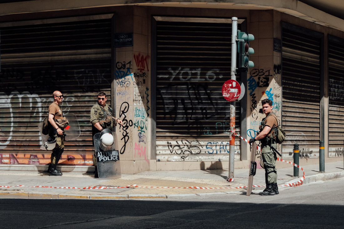 Pünktlich zur Landung des Flugzeugs streikte die Metro. Immerhin haben die Taxis jetzt eine Flatrate von 38 Euro für die Fahrt zum Zentrum Athens, die draussen vor dem Flughafen groß ausgewiesen wird. Die Stadt selbst? Fast ausgestorben. Alle, die es sich leisten können, machen am 1. Mai einen Ausflug auf’s Land. Zurück bleiben oft die, die sich gar nichts mehr leisten können. Zurück bleiben die Plakate und Poster und Graffitis, die von der nahen Revolution künden, während die Polizei routiniert ihre Posten bezieht. Beobachtet von Zuschauern, von denen manche mit leerem Blick in die Zukunft starren. Während ein Denkmal davon kündet, dass Hellas leben will – und leben wird.