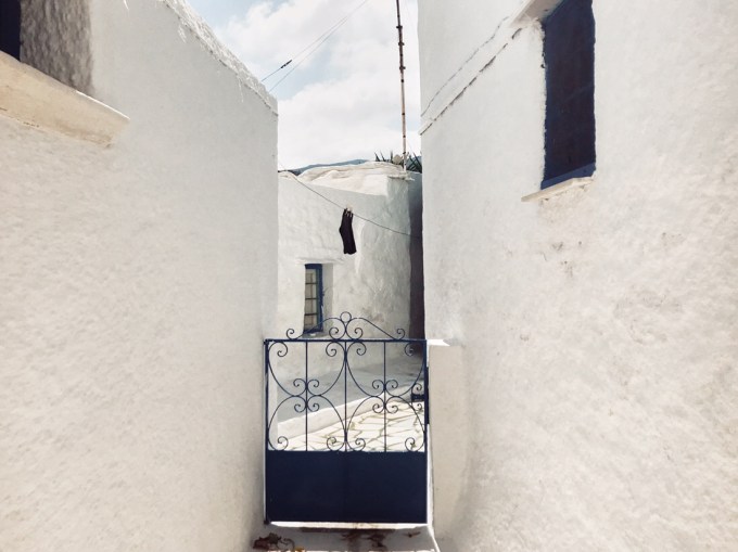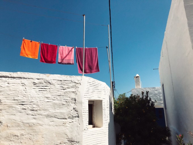 Über kleine Straßen und durch viele Kurven und immer höher hinauf. Die braune, trockene Erde auf Tinos gegen den hellblauen Himmel. Zahllose weiße Häuschen stehen vereinzelt in der Landschaft, nicht immer schön, nicht immer stimmig, eher Zeichen von Zersiedelung. Irgendwann dann, nach vielleicht 30minütiger Fährt, ein Ort, so hübsch, dass man Hauswände oder den Boden fotografieren kann und mühelos schöne Rahmen findet: Pirgos. Das Dorf der Marmorgewinnung. Ein Ort, in dem Bildhauer handwerklich ausgebildet werden, bevor sie in Athen auf die Kunstakademie gehen. An so einem Ort sehen selbst die aufgehängten Socken des Popen stimmig aus.
