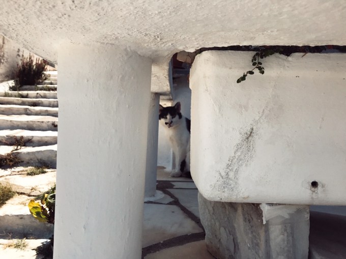 Driving on small streets and into countless turns. The dark brown soil of Tinos island against the azure sky. After 30 Minuten drive a village, so beautiful, that you can take pictures of the ground or walls – you won’t get an ugly frame: Pirgos. Home of marble quarrying and place where young artist learn to sculpture. Even the priest’s socks look like art in such a place.