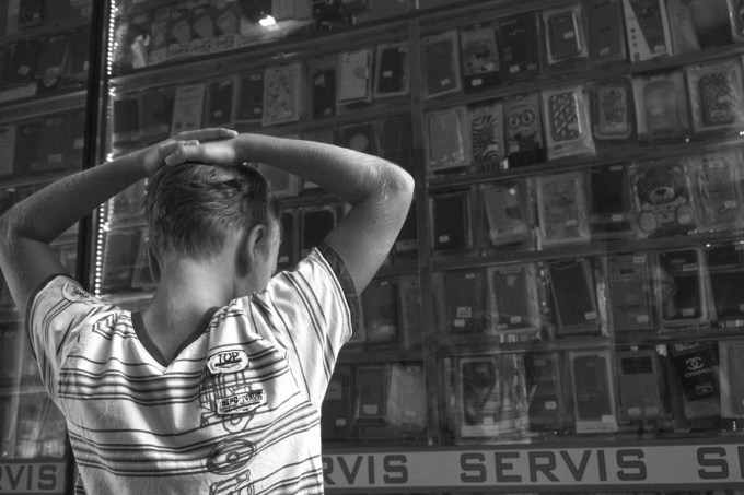 Die zweite Begegnung in der Nähe des Platzes des Republik. Eine heruntergekommene Einkaufspassage über mehrere Ebenen. Ich sehe einen vielleicht 40jährigen, der auf dem Boden hockt und sich einen Joint dreht. ‚Schön hässlich‘ sagt er auf Englisch, als er sieht, was ich fotografiere. Wir kommen ins Gespräch. Er arbeitet in den Cafés der Umgebung. Ich sage ihm, dass ich griechische und deutsche Wurzeln habe, als er fragt, wo ich herkomme. Und dass ich vor kurzem Zagreb und Sarajevo besucht habe. Er erzählt mir, wie irrsinnig die Feindschaft zwischen Serbien, Bosniern und Serben sei. Im Grunde seien sie ein Volk, nur durch Religionen getrennt. Die Bombenangriffe auf Belgrad durch NATO Flugzeuge hat er in Erinnerung. Ich solle Vuk Draskovics’ Buch ‚Noz‘ (Das Messer) lesen, das der vor dem Krieg geschrieben habe. Dann verstünde man den jugoslawischen Wahnsinn und seine Ursachen besser.