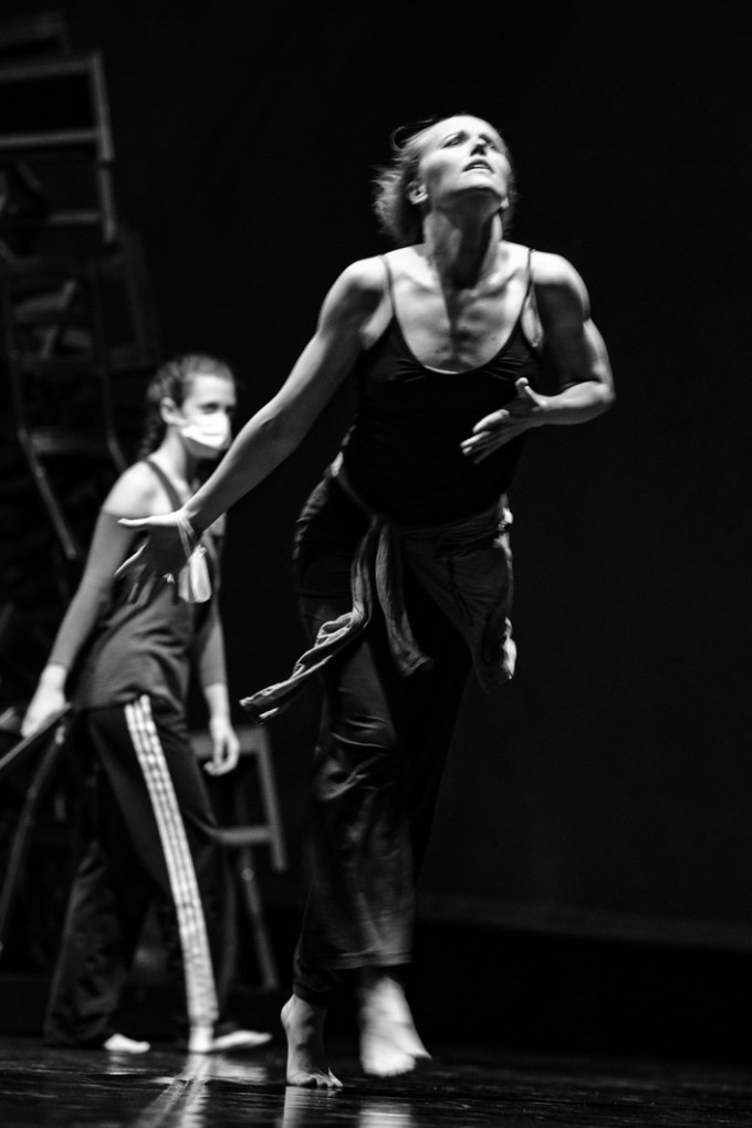Ihr neues Stück nennt sich: „Der Turm“ und wird getragen, ach was, nach vorne gepeitscht von den minimalistischen Kompositionen des Amerikaners Philipp Glass. Vor etwa zwei Wochen hatte ich (getestet natürlich) die Gelegenheit, dieses dunkle, atmosphärisch so beklemmende wie mitreißende Stück in einer Bühnenprobe zu sehen und aus einiger Distanz mit dem Tele-Objektiv Aufnahmen machen. Wirklich eine beglückende Erfahrung, endlich wieder Bühnentanz live zu erleben. Premiere mit Publikum ist am 4. Juni.
