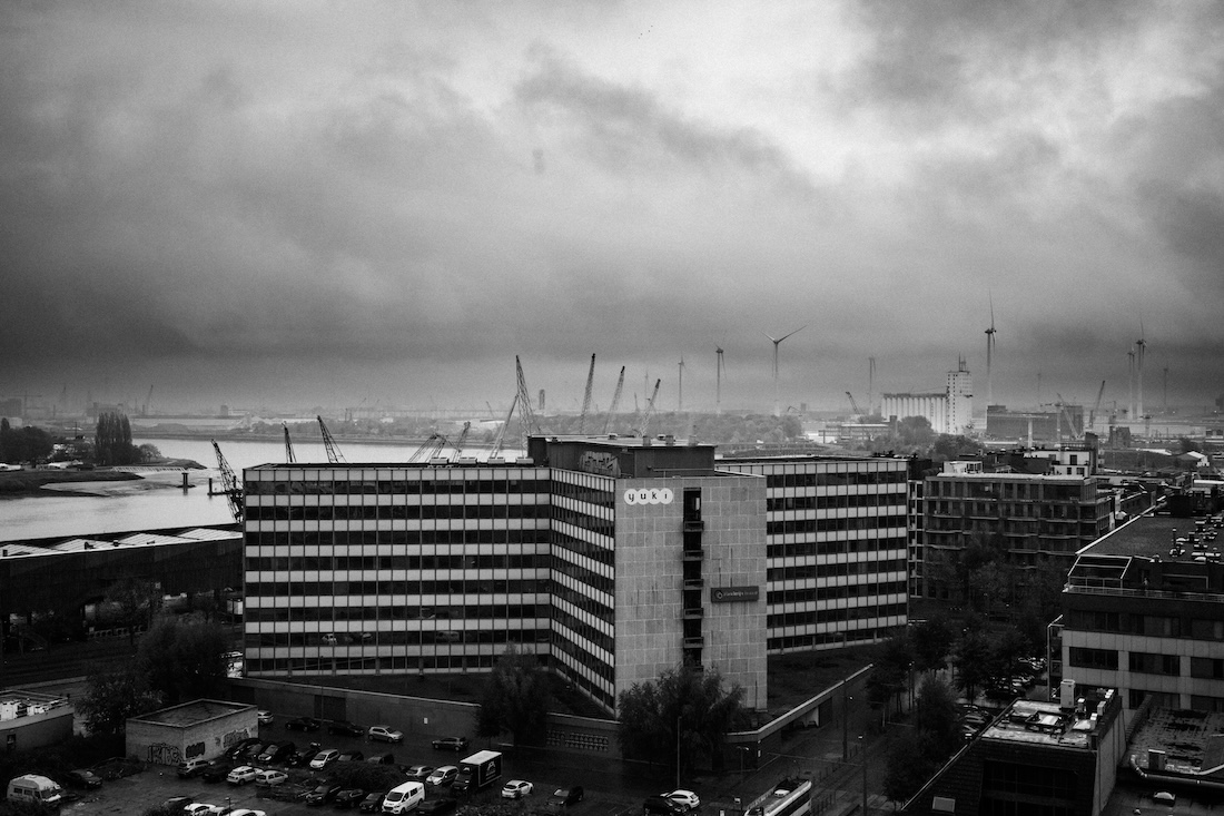 Wir spazieren im Regen. Dunkle Gassen, mittelalterliche Häuser, dahinter, dazwischen moderne Bauten aus Beton. Die gab es noch nicht, als der Dichter Charles Baudelaire die Stadt besuchte. Laut KI war er fasziniert von den dunklen Gassen und der melancholischen Atmosphäre der Stadt. Direkt am Hafen eine rostrot leuchtende Architektur-Ikone: das MAS (Museum aan de Strom). Wir fahren mit Rolltreppen auf die Dachterrasse des Museums und überblicken die Stadt. Feiner Nieselregen schafft eine unwirkliche Lichtstimmung. Eingefangen mit der kleinen Ricoh GR IIIx im dunklen und dramatischen High Contrast Black and White-Modus.